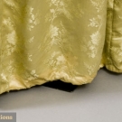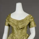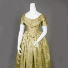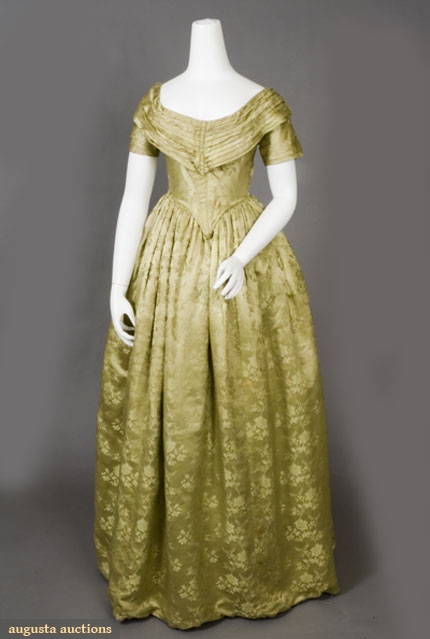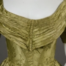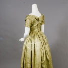 Pale chartreuse green satin with jacquard floral pattern, wide neckline has tucked collar overlay, short sleeves ending in tucks, fitted and boned bodice, deep V at center front and back, skirt gauged to cotton band and tacked to bodice, back opening with brass hooks, piped seams, bodice cotton lined, skirt crinoline lined, (small section of skirt ungathered at back) excellent.