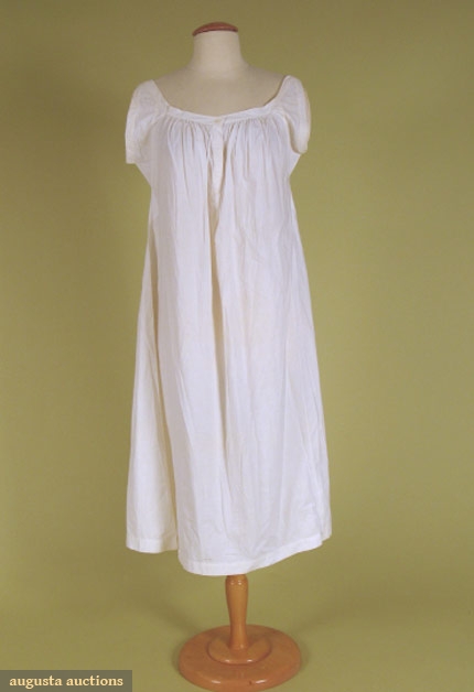 Wide neckline, center front button placket and very short sleeves, edged with triple rows of cording, machine sewn, knee length, one shell button, (one tiny hole) excellent.
