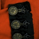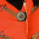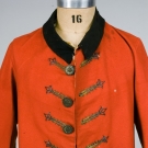 Wool broadcloth, single breasted, narrow black silk velvet collar and cuffs, trimmed with gilt and sequin buttons and gold metallic needlework outlining each button and buttonhole, fitted long sleeves, embroidered and button trimmed side pocket flaps, center back vent and pleats trimmed with buttons, cream silk twill facings, (torn cuffs and collar, many moth holes, stains, four missing buttons) fair.