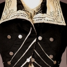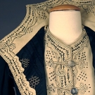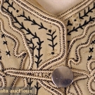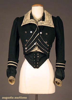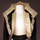 Black & cream wool felt w/ contrasting black & cream embroidery & soutache, silver military style buttons, B 36", W 25", L 20.5", (cream satin lining damaged) excellent.