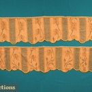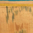 Twill weave, natural slubbed silk, shades of tan & green w/ yellow & blue pinstripes, green vertical stripe alternates w/ stylized chine flowers, scalloped edge bound in yellow homespun linen, coarsely woven linen header, selvedge-selvedge 18.5", Wd 14", L 82", excellent; t/w 1 smaller piece, L 53", (damaged) fair.