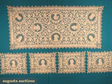 Each mat has center needle lace rondel w/ portrait of different European king or queen surrounded by Milanese tape-lace, needle lace fleur-de-lis in square at each corner, 13.5" x 17.25"; runner w/ 8 royal portraits, 27.25" x 59", (several brown stains) good.