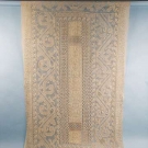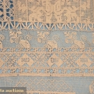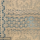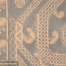 Linen & handmade, narrow center filet lace panel w/ repeating rococo design w/in reticella frame surrounded by larger gauge filet lace w/ stylized floral embroidery, cantu lace outer border, 62" x 116", (some small breaks in lace border) excellent.