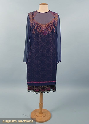 2 piece dress: under sheath of black & gold metallic lace, over dress of gold stencilled navy georgette trimmed w/ rhinestones & pink beads, B 37", W 31", H 40", L 41", excellent.