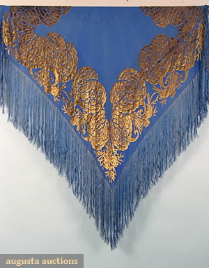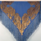 Dull gold silk velvet Deco shapes cut to electric blue silk chiffon, 51" X 54", w/ 15" fringe, (light stains) good.