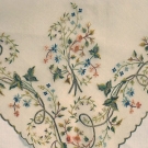 Fine white mull w/ colored silk & gold thread embroidery in leaf, vine, & floral spray pattern, scalloped edge worked in gilt thread, 37" x 62", excellent.