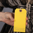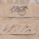 2-pc silk chiffon printed w/brush stroke stripe & horizontal bands, silk lace dickie w/ stock collar & scalloped stomacher of 1860s black chantilly lace, pleated cummerbund W band, skirt pieced of alternating chantilly lace & chiffon bands, lined in silk taffeta w/ pinked ruffle, label “C Worth, Paris,” w/ couture tape partially legible #14641(?), (wear CB collar, chiffon trim at neck & underarms damaged, several sm light scattered stains in skirt, few thread pulls in chiffon up to 4", bodice Wband untacked along top w/ fraying/few sm holes, sm tears in chiffon & up to 1.5” in lace around skirt W, few broken brides/sm breaks in lace, lining moderately shattered, repairs/reinforcements to lining at bodice & Wband) good. MOHAI.