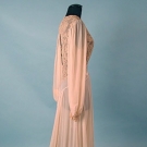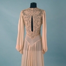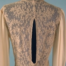 Off white silk chiffon w/ ecru lingerie lace & ivory satin appliques, trained robe opens at top w/ 13 satin buttons, B 36", W 26", Front L 56", (small stain in skirt on side) excellent.