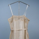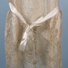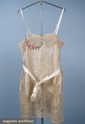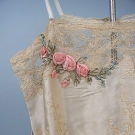 Ivory silk charmeuse w/ ecru embroidered lace, ribbon rose & forget-me-not trim, excellent.