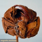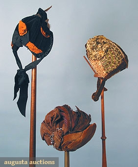 Bonnets: 1 brown straw woven w/ cream horsehair trimmed w/ brown velvet, olive silk brocade ribbon & cloth flowers; 1 midnight blue velvet w/ rust ribbon; 1 hat brown velvet w/ cut steel decoration, striped silk ribbon & pheasant feathers, excellent.