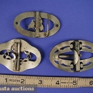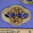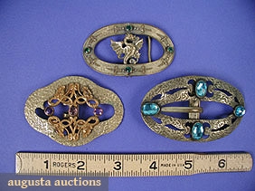 Oval or lobed oval form: 1 brass & gilt w/ amethest glass stones; 1 winged griffin w/ emerald glass stones; 1 pierced & etched stone w/ blue glass stones, excellent.