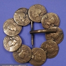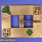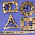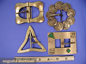 All brass or brass finished: 1 w/ coins; 1 w/ cabuchons & swastikas; 1 triangular; 1 lobed rectangular marked Royal Mfg., excellent.