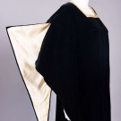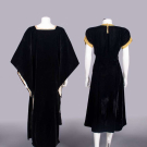 1 black silk velvet dress w/ lame’, gold & celadon crochet to neckline & shaped short sleeve cuff, CB crochet button closure over small keyhole, B 38”, W 30”, L 45”, (slip N/I, 1”x1'' repaired L-shape tear left slv, minor discoloration at collar, few areas of light wear to velvet); 1 black silk velveteen tabard style evening dress w/ french needle lace to square neck opening, triangular medieval hanging sleeve w/ white satin lining, deep side seam slits laced w/ black tasseled cord, label “D.E. Carena, Firenze”, SH-SH 26”, B 42”, L 54”, (discoloration to lace at collar & white satin slv lining, few tears in lace up to 1”, some minor crushing to velvet esp. lower CB) both very good.