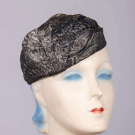 3-pc of silver lame’ in dense abstract frond motif on black silk ground c/o sleeveless evening gown w/ V neckline, decorative CB self covered buttons, inset front panel into deep floor length hem flounce, matching long sleeve evening jacket w/ shaped shawl collar, paired CF button closures, ruffle cuff & peplum, matching turban style hat, jacket B 40”, L 23”, gown B 40”, W 36”, L 53”, hat circ. 21”, Ht 3.5”, (minor tarnish throughout, light underarm discoloration, wear & pulls to jacket underarms, minor seam strain CB jacket, few seam openings b/t panels at gown hem up to 2.5”, discoloration lower back right skirt, minor pulls in lame’) very good. Provenance: From the Estate of Lydia Gordon.