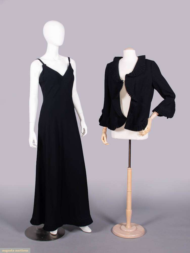 2-pc black wool crepe evening dress w/ slender SH straps, V neckline, knife pleated hem, CB zip closure, black china silk lining & jacket w/ knife pleated collar, CF opening, hem & cuff & white crepe back satin lining, both pieces labeled “Cardinali”, jacket SH-SH 20”, L 25”, dress B 38”, W 30”, L 58”, (bra added?, few tiny pulls, few tiny stains left cuff, light wear) excellent.