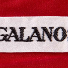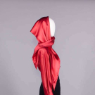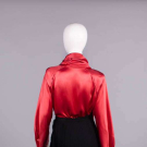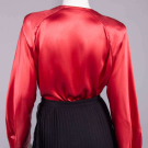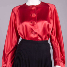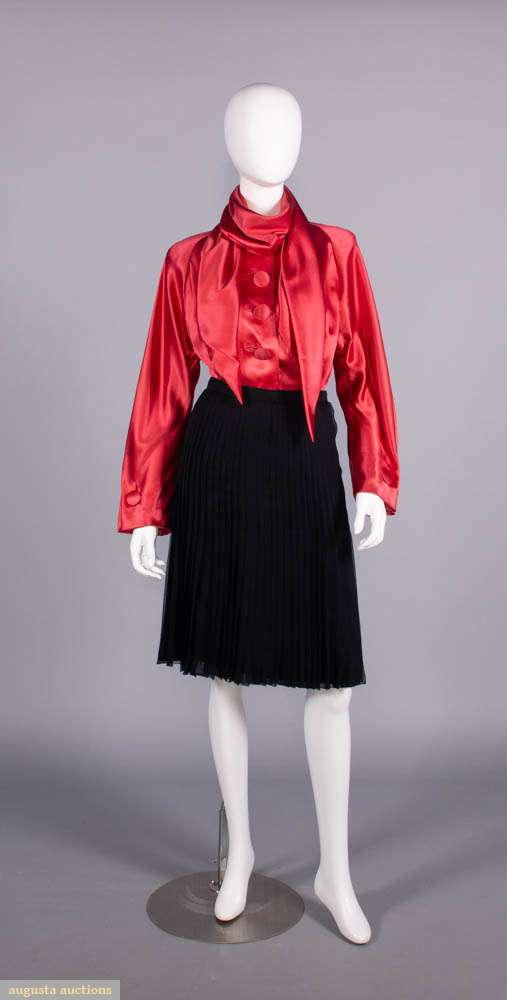 3-pc ensemble c/o red silk satin blouse w/ large self covered cf button closures, raglan slv w/ cufflink button closure, lined in silk chiffon, matching wrap, multilayer black silk chiffon skirt w/ pleated overlay, label “Galanos”, blouse B 40”, L 24”, scarf 12” x 68”, (cluster of tiny marks lower right slv & scarf hem, minor thread pulls tiny-3”, minor fraying skirt W band & hem) very good. Provenance: From the Estate of Lydia Gordon.