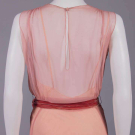 1 off-white satin w/ inserted flat butterfly bow bursting from SH blade slits, piped edges at neckline, armscyes & back SH slits, slender self tie at W, B 34”, W 30”, L 55”, (underarm discoloration, light stains CF bodice, 2.5” stain above hem, scattered light stains up to 1”, light discoloration, few loose threads); 1 pink silk georgette gathered & draped into CF ruching, deep rose colored silk velvet sash, B 38”, W 26”, L 60”, (slip N/I, light tidemarks to skirt, many sm holes, minor underarm discoloration, few wear spots left underarm, minor crushing to velvet) both good.