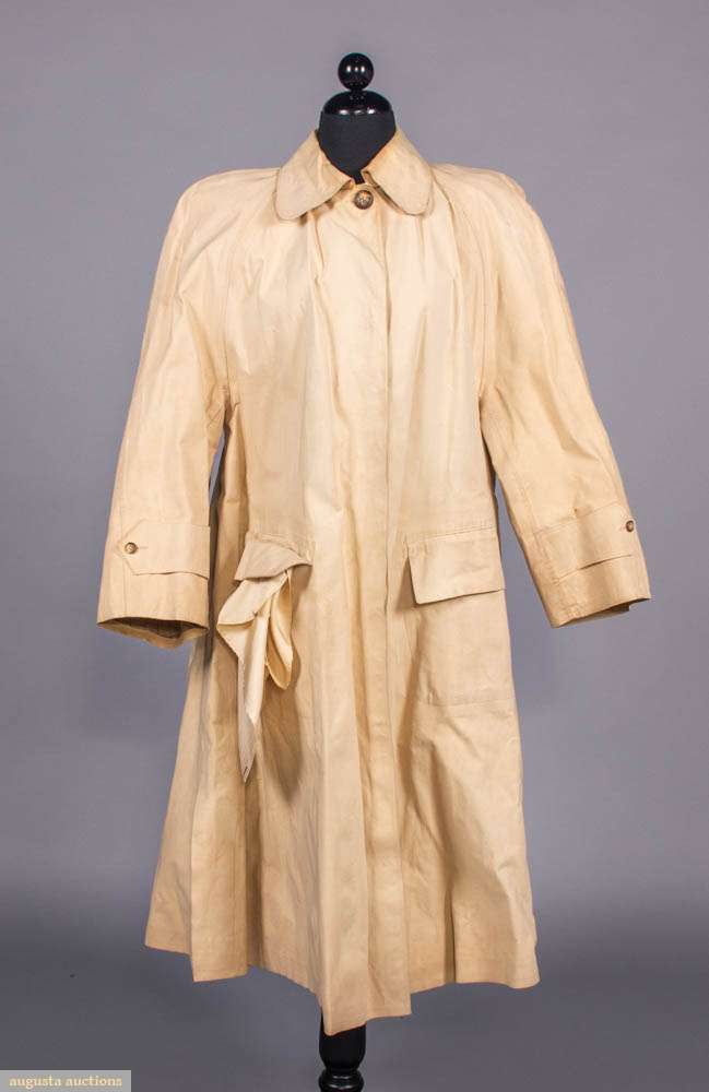 1 waxed cotton raincoat w/ twill silk windowpane check cuff & pocket facings, 1930s, label “Hermes, Paris”, fair-good; t/w twill silk handkerchief labeled “Hermes, Paris”. Provenance: From the Estate of Lydia Gordon. Measurements & condition report available upon request.