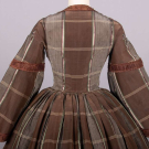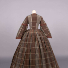 Wool & silk blend day dress in ikat warp ribbon stripes on large windowpane ground w/ brown silk quilling to pagoda sleeve & neckline into either side of CF closures, lined in twill cotton, glazed hem facing, wool hemsaver, B 30”, W 24”, L 56”, (CF closures altered, 6” horizontal tear lower left skirt, underarm discoloration & shredding, broad light wear esp. to grey stripes, heavy wear at W pleats, several 0.5”-3.5” light stains around hem) Good.