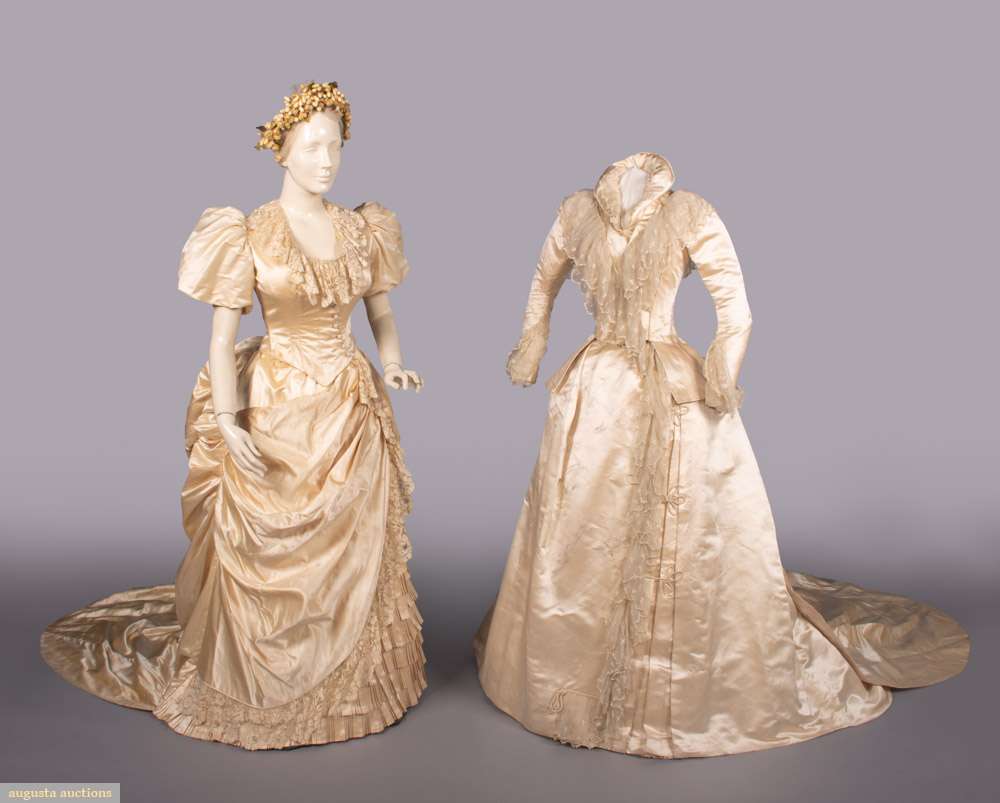 TWO SILK SATIN WEDDING GOWNS, c. 1880 & c. 1883