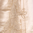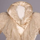 2-pc cream w/ Spanish lace to neckline & faux pearls, thread covered asymmetrical CF button closure, trained skirt w/ same lace & triple box pleated ruffles, wax orange blossom headpiece & remnants, 1883, 1/2 silk short slv updated early 1890s, B 34", L 15”, skirt W 24”, L 39”-68”, (shattering, discoloration, spot stains to 1.5”, boning warped w/ shot elastic, minor trim loss/seam openings, headpiece damage) Fair; 2-pc w/ mm embroidered silk chiffon in fleur de lis motif, lined in silk twill, silk cord to wired standing collar, looped embellishment to tabbed peplum & side of skirt, skirt lined in buckram w/ taffeta & satin pleated dust ruffle, c.1880, B 29”, L 21”, skirt W 22”, L 40-75”, (discoloration, minor shatter Wband, chiffon tattered at neck, sm se