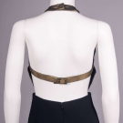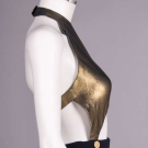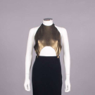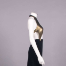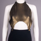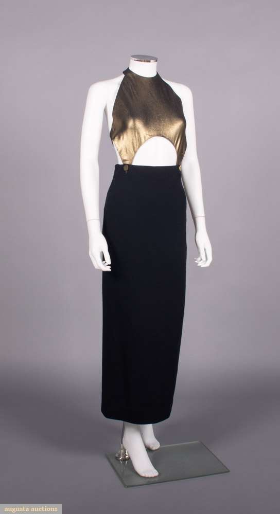 Gold lame’ & black spandex cutaway halter top w/ decorative button on black wool jersey skirt, label “Geoffrey Beene”, B 32”, W 25”, L 52”, (light wear/minor finish loss to spandex at closures, light scratching buttons) Very Good. Provenance: sold 11/20/19 Hindman’s Property from the Geoffrey Beene Archive, lot 179 Archive Inventory No: 3812