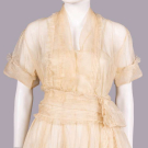 1 pina fiber w/ Heilmann embroidered lace cuffs & hem flounce, pintucking to bodice & chemical lace insertions, c. 1915, B 34”, W 26”, L 48”, (many tiny-1” stains esp CF, heavy discoloration left SH); (all w/ slips N/I, varied light-moderate discoloration); 1 pina fiber day dress w/ Italian hemstitching & hand cross tucks, organdy hat w/ bobbin lace bim, 1918, dress B 38”, W 26”, L 50”, (tiny-0.25” holes) hat circ. 22”, H 4”, W 14”, (tiny-0.5” tears & pulls brim, few broken brides, shatter to lining); 2-pc white cotton & net dress w/ filet lace & philippine embroidery, c. 1919, underdress B 30”-34”, W 28”, L 48”, tunic B 34”, L 35”, (sm holes & stains, few 0.5”-1.5” repairs & 1” tears CB bodice) All good. Deaccessioned by the Valentine Museum.