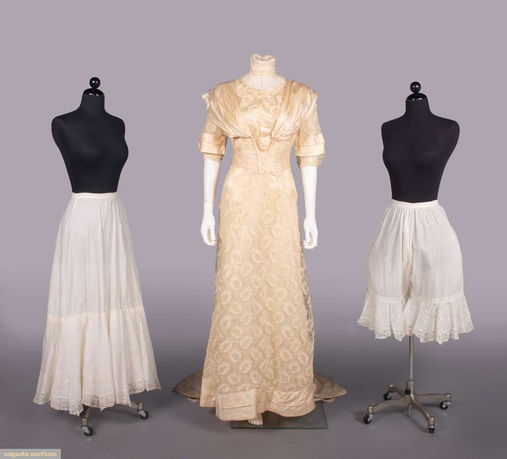 SILK SATIN & LACE WEDDING GOWN WITH UNDERGARMENTS, 1910