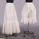 Cream silk satin w/ mm lace overlay, silk chiffon standing collar & yoke, satin panels from B over SHs into train w/ covered & embroidered buttons to CB W, cotton flannel lining, B 33”, W 23”, L 58”-80”, (heavy shatter chiffon collar & sleeve lining, few tiny-1” breaks in lace esp. bodice & sleeves, few tiny-0.25” light stains, light discoloration w/ minor shatter & scuffs CB train) very good; 1 pair cotton drawers & petticoat w/ lace insertions & Philippine hand embroidery, drawers W 28”, L 23”, petticoat W 32”, L 36”, (both w/ minor discoloration, few sm holes in lace, petticoat w/ sm stains) Both excellent. Deaccessioned by the Valentine Museum.
