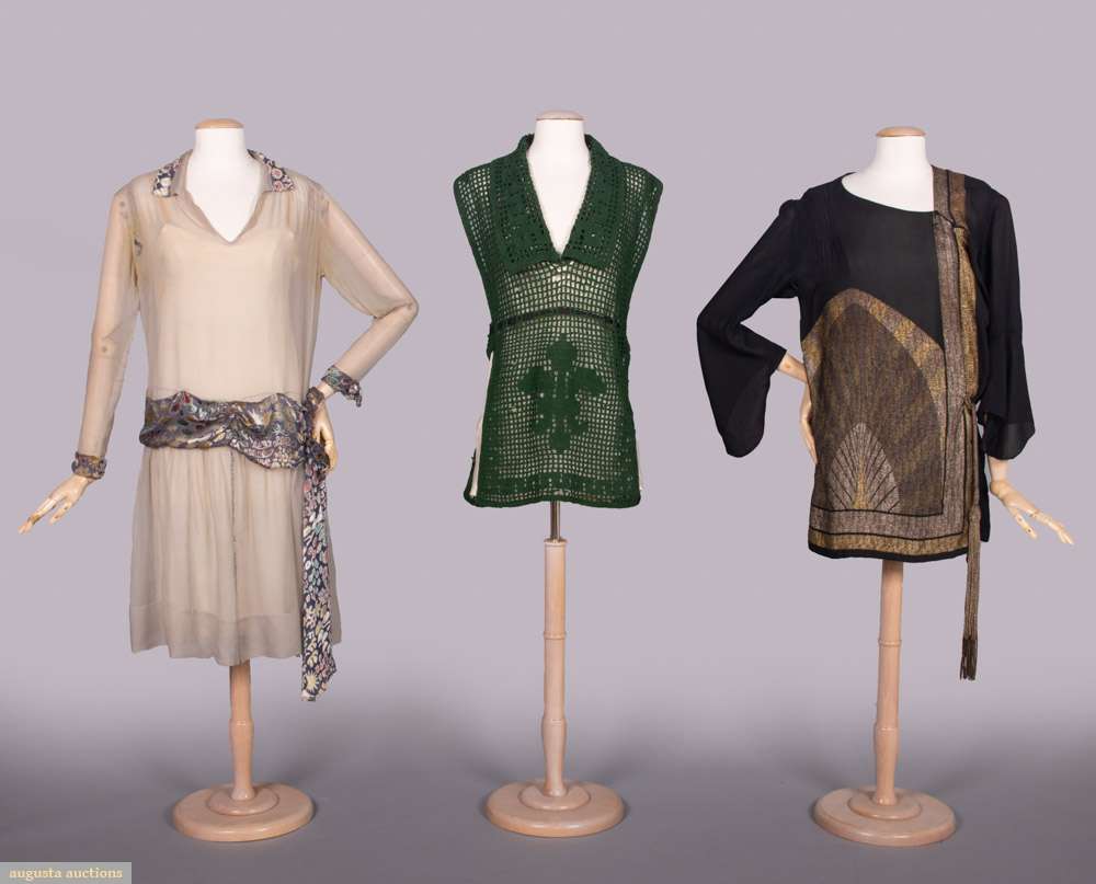 1 dove grey silk crepe chiffon day dress w/ collar, cuffs & swagged W into side drape all of overprinted floral devore silk velvet on purple chiffon ground, skirt panels w/ silk floss fagotting, 1925-1926, B 38”, W 34”, L 38”, (slip N/I, discoloration, shatter at underarms w/ 1.5” tear right, pulls, tiny-1” holes) Fair; 1 forest green merino wool crochet tunic w/ fleur de lis motif, 1920s, W 34”, L 28”, (slip N/I, minor pulls, few breaks CF hem, light wear) Good; 1 black silk georgette tunic w/ woven lame’ geometric Deco motif & side W tie termiting twisted lame’ tassel, c. 1923, B 40”, L 32”, (SH clasp removed & turned into belt, 2” & 4” tears right underarm, wear & 0.5” hole left closure, tiny pulls & tarnish to lame’, few sm seam openings) Fair.