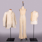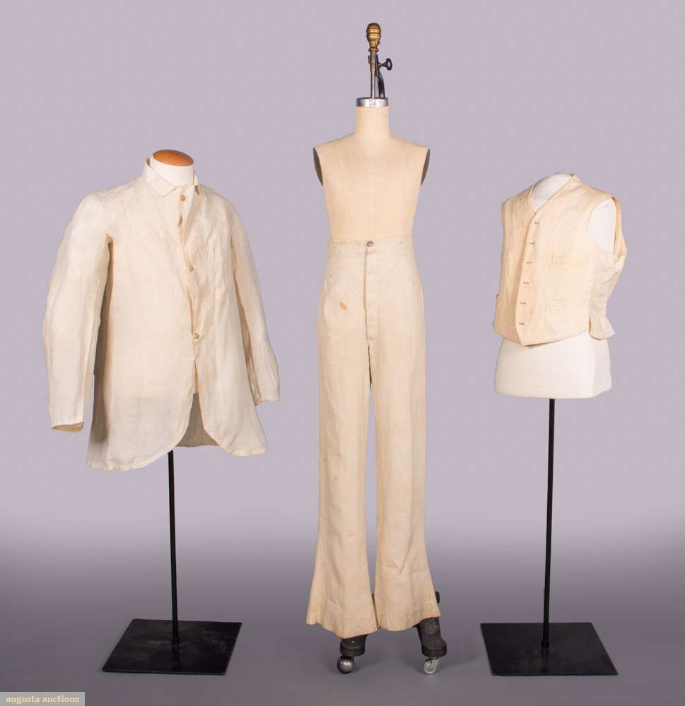 1 linen summer jacket w/ vegetable ivory buttons, 1860s, CH 42”, L 32”, (scattered tiny-0.25” holes & tiny-1” stains, wear to cuffs w/ few 0.5”-2” seam openings) Good, (all w/ broad discoloration); 1 pair white linen trousers w/ foil button fly, 1840s, stamped & inked “Hairston”, W 26”, inseam 33”, (stains up to 3”, areas of seam strain, sm wear spots, heavy wear & 1.5” frayed opening seat, many pinholes CB W tabs, heavy wear hems) Fair; 1 vertical ribbed cotton waistcoat w/ linen backing, 1864, CH 40”, L 21”, (light wear, no closures) Good. Deaccessioned by the Valentine Museum.