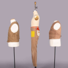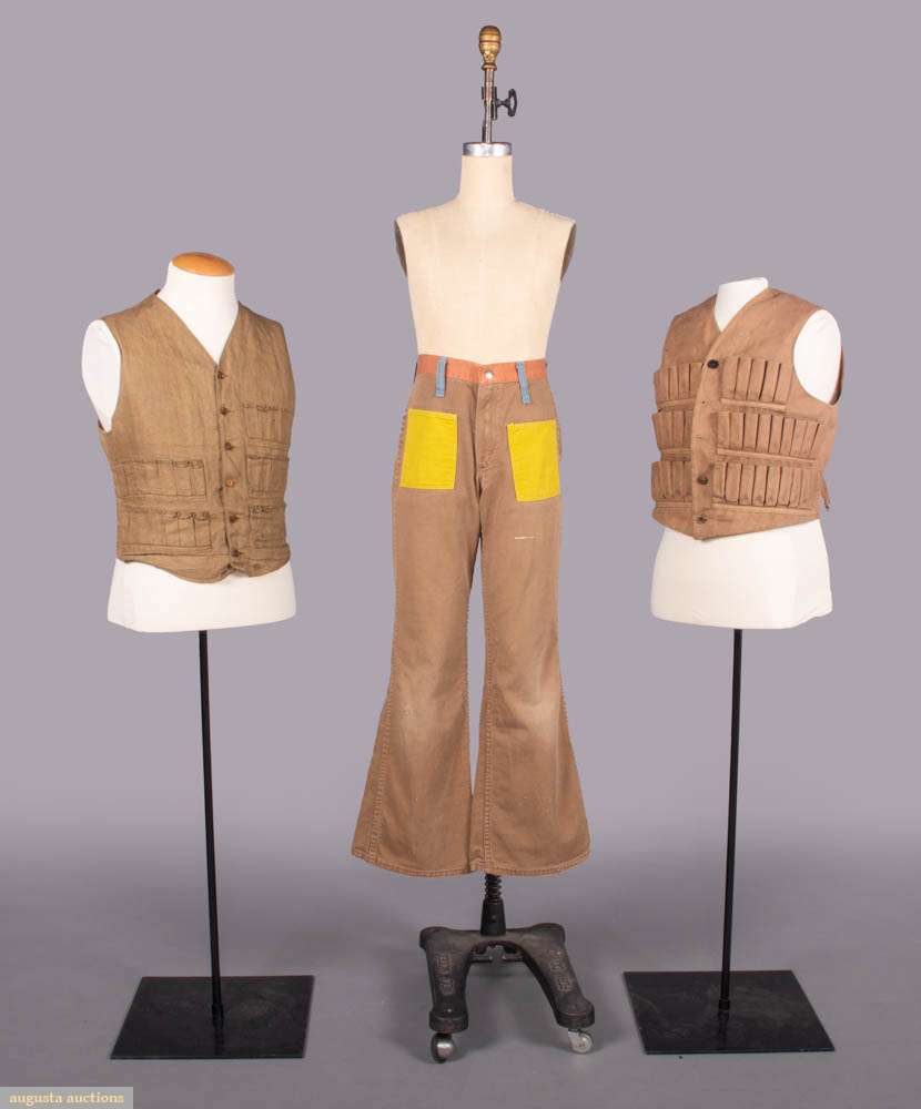1 cotton canvas hunting vest w/ 5 rows of cartridge pockets, 1920, CH 40”, L 22”, (tiny-0.5” stains, 1 mismatched button, minor discoloration); 1 brown cotton canvas hunting vest w/ single hunting dog motif button, 1925, CH 36”, L 20”, (discoloration/wear, buttons missing/mismatched, 0.5” tear CB); 1 pair khaki brown jeans w/ canary yellow front patch pockets, orange, red, blue & peach W yoke, 1975, labels “Peter Max” & “Wrangler”, W 24”, inseam 28”, (wear, pulls, 2” paint mark left leg, 0.5” wear spot right knee) All good. Deaccessioned by the Valentine Museum.