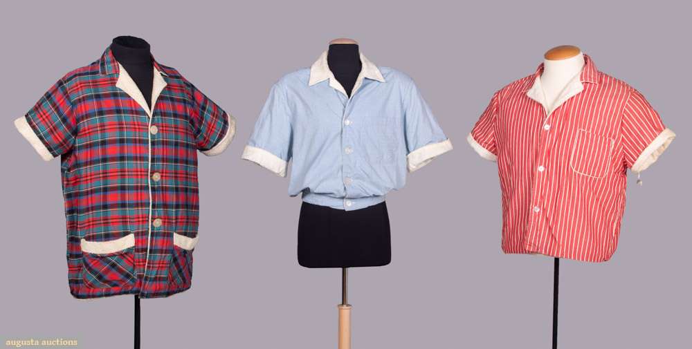 All cotton w/ white terry cloth lining: 1 plaid w/ patch pockets & button closure, label “Harcourt”, CH 46”, L 32”, (light discoloration & wear to terry) Good; 1 powder blue w/ woven white grid pattern w/ raised dots, elastic W, label "Harry Allenfall, Duluth”, CH 42”, L 22”, (light discoloration collar lining) Excellent; 1 w/ woven red & white striped w/ white terry cloth lining, CH 48”, L 24”, (discoloration right cuff, light wear) Good. Provenance: From the Estate of Lydia Gordon.