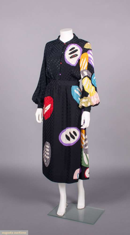 2-pc w/ satin faced polka dot on silk crepe ground over printed in multicolor large abstract motif, single slash pocket inserted into motifs on left B & right H, both pieces w/ label “Vollbrach Too”, print signed “Michaele Vollbrach”, blouse B 36”, L 24”, skirt W 26”, L 32”, (pinhole left blouse hip) Excellent.