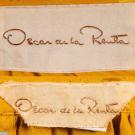 2-pc marigold patterned silk w/ satin leaf motif c/o blouse w/ band collar, CF buttons closures & full sleeve w/ fitted cuff, matching tiered ankle length skirt, label “Oscar de la Renta”, blouse B 36”, L 24”, skirt W 26”, L 38”, (few scattered tiny-0.25” light stains), Excellent. Provenance: From the Estate of Baroness Aino Bodisco.