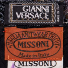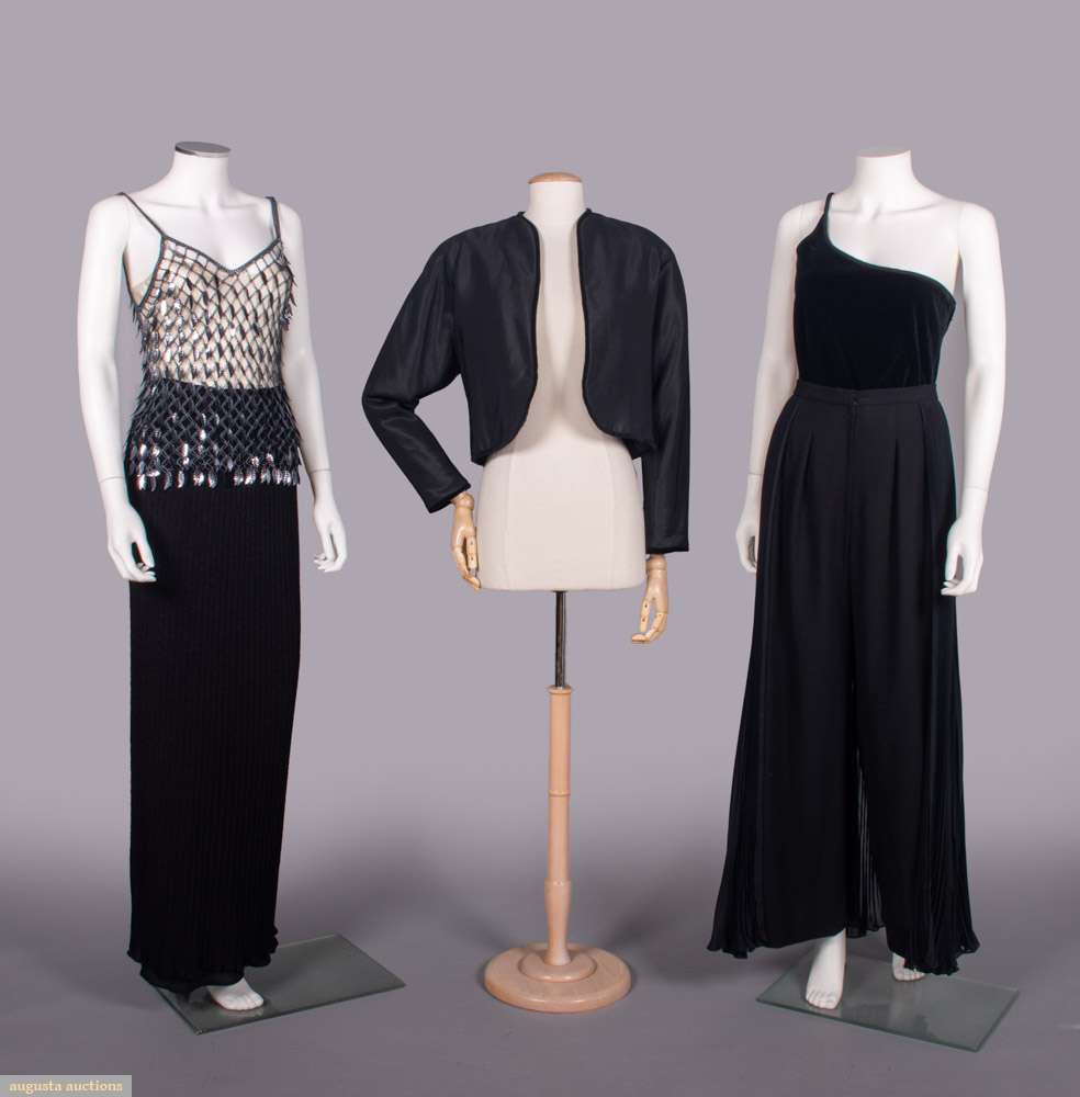 1 navy knotted silk net tank top w/ leaf paillettes, label “Gianni Versace Couture”, B 28”-36”, L 25”, (slip N/I, few sm pulls straps & underarms); 1 black knit boucle skirt w/ synthetic lining, label “Missoni, Maglia Knitwear Tricot”, W 22”-26”, L 42”, (shrinkage/lining longer than hem, label partially unstitched, light wear); 2-pc french black cotton blend velvet single SH strap tank, jacket of ribbed silk blend w/ same cotton blend edging, twill silk lining, label “Gianni Versace”, top B 34”, CFL 15”, jacket B 36”, L 16”, (light wear); 1 pair black wool crepe palazzo pants w/ ray pleated midnight navy chiffon overlay, label “Jacques Fath Boutique, Paris”, W 27”, inseam 28”, (light wear); All Very Good-Excellent.
