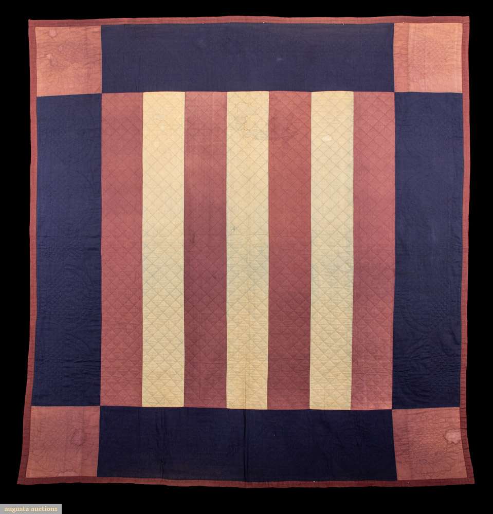 Bars summer quilt in dusty rose, navy & pale celadon w/ border squares quilted in sunflower & basket motifs, grey backing, embroidered initials “B.L”, 73” x 77”, (light fading to green, minor thread loss, few 0.25”-6” light tidemarks & tiny stains, areas of minor discoloration) Very Good. International Quilt Museum at the University of Nebraska-Lincoln.