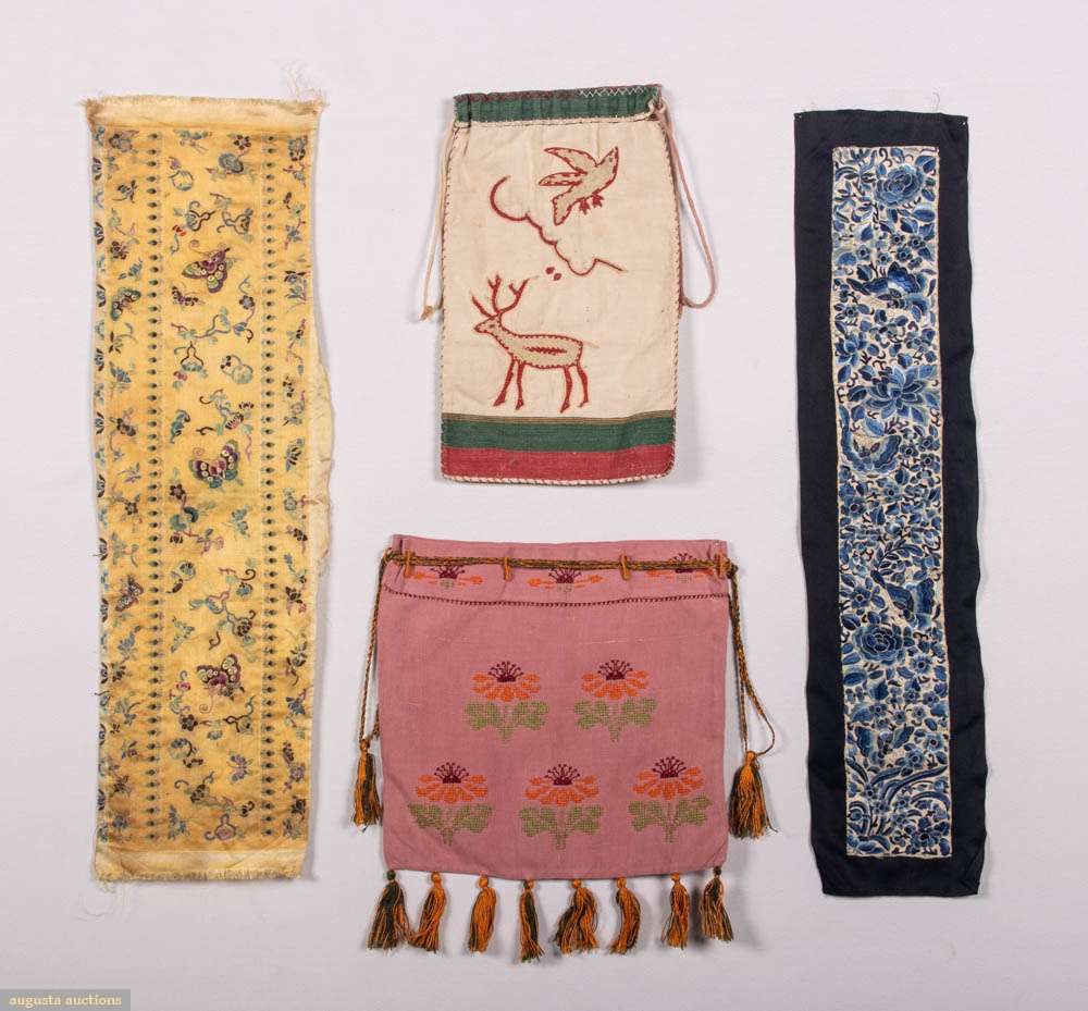 1 embroidered w/ butterflies, foliage & vine motifs on saffron satin ground, 7” x 24.5”, (discoloration, fraying at ends) Good; 1 Scandinavian embroidered cotton bag, 7.5” x 12.5”, (light wear & discoloration) Very good; 1 cross stitch embroidered linen bag, likely Mediterranean, 10.5” x 10.5”, Excellent; 1 single Chinese embroidered sleeve band in blue ombre satin stitch in floral & butterfly motifs on cream satin ground w/ black satin backing, 3.5” x 22”, (light wear, few sm mends, few tiny holes backing) Very good.