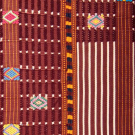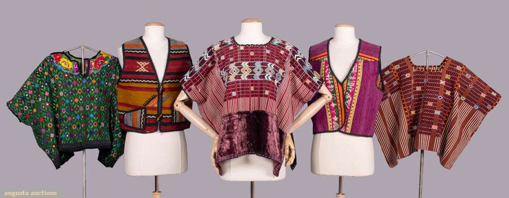 1 burgundy huipil w/ plush hem, Wd 64” x L 24”, (sm pulls, wear spots CB collar, light wear); 1 huipil green & multicolor floral pattern on black ground w/ embroidered yoke, Wd 35” x L 19”, (~2” seam openings underarms, sm pulls, hem somewhat uneven, light wear); 1 brown/white stripe huipil w/ multi colored inlaid block w/ diamond pattern, Wd 64”, L 20”, (light wear); 1 red, black & green wool vest of weft faced plain weave & inlaid patterned details front patch pockets & toggle closures, CH 38", L 19", (sm pulls/wear spots, few areas of shatter & loss to black binding & lining); 1 warp faced patterned striped vest w/ multicolor flora & fauna motifs & dyed purple wool panels, CH 40”, L 21”, (minor fading, sm pulls) All good-excellent.