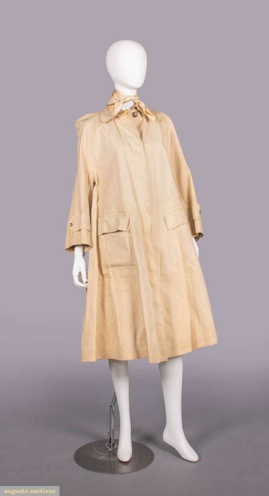 1 waxed cotton raincoat w/ twill silk windowpane check cuff & pocket facings, 1930s, label “Hermes, Paris”, B 42”, L 44”, (broad loss of waxed finish, discoloration, few sm stains & pulls, very stiff) Fair; 1 twill silk handkerchief labeled “Hermes, Paris”, 16” x 16”, (light discoloration, few sm pulls) Provenance: From the Estate of Lydia Gordon.