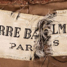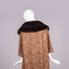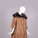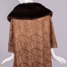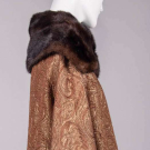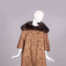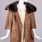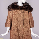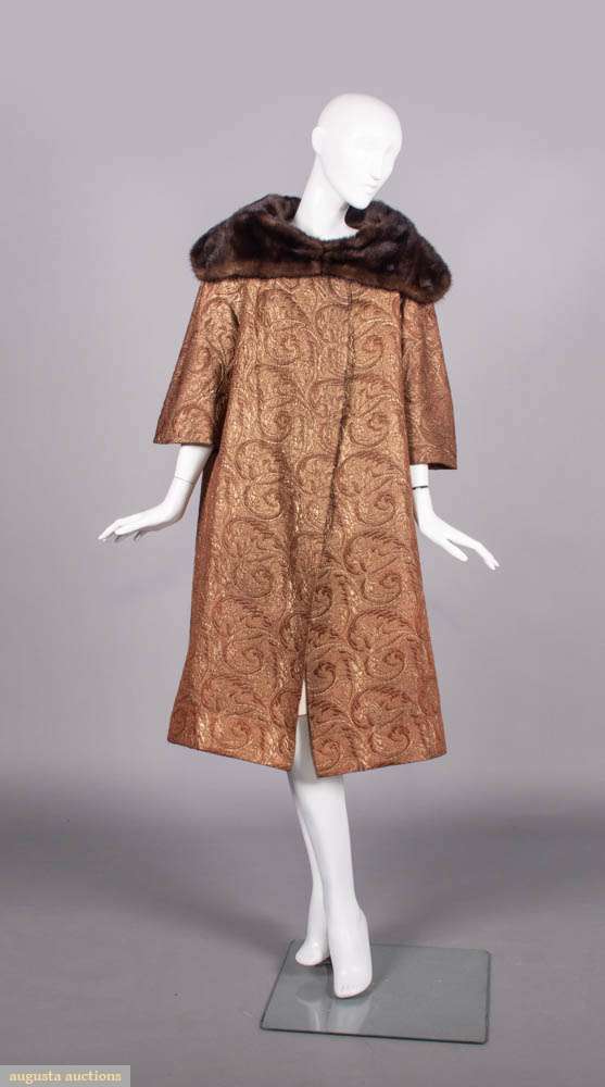 Cocoa brown silk & gold lame matelasse’ coat w/ broad mink fur collar over single cross over hook & eye closure, cafe au lait silk lining, c. 1960, label “Pierre Balmain, Paris”, B 44”, L 42”, (label shattering/torn, moderate wear & thread loss along collar, CF placket edges & right underarm-pocket area, wear & light discoloration at hem, minor wear to fur) Good.