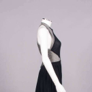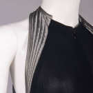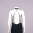 Black silk jersey evening dress w/ grey satin w/ metallic top stitched quilting, label “Geoffrey Beene, New York”, inked label “1902, Fall 1990”, B 33”, W 25”, L 60”, (light wear) Excellent. Identical dress donated by Geoffrey Beene to the Metropolitan Museum of Art in 2001, accession # 2001.393.99. Provenance: sold 11/20/19 Hindman’s Property from the Geoffrey Beene Archive, lot 192, Archive Inventory Inventory No. #1467.