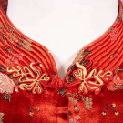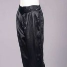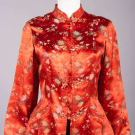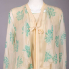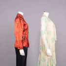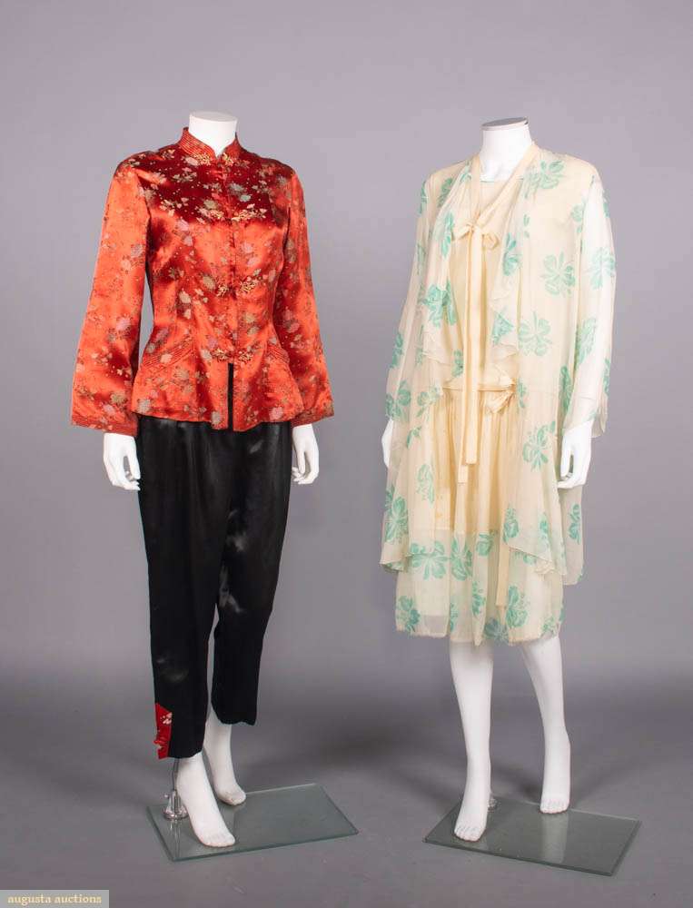 2-pc export pajamas c/o patterned silk top & black satin bottoms w/ patterned satin trim, both w/ elaborate standing frog closures, label “Imperials, Hong Kong”, top B 34”, L 24”, pants W 30”-32”, inseam 23”, (light wear, minor discoloration top,, 1.5” seam opening CF top waist, minor fabric strain SH, pants CB W elastic shot) Good; 2-pc silk crepe garden party dress w/ printed crepe de chine coat & hem, c. 1924, dress B 35”, W 34”, L 44”, jacket L 36”, (discoloration especially skirt, hem cut shorter, shatter to W ties, pulls, jacket: light underarm discoloration & few 0.25”-0.5” light stains) Fair.
