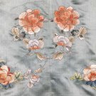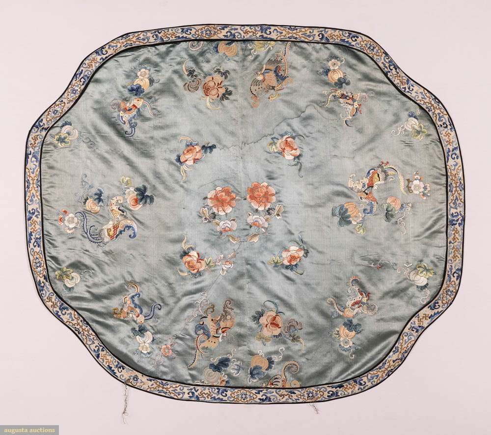 Panel of light blue silk satin, satin stitch & peking knot rose & chrysanthemum w/ winged fauna motif, border of couched gold thread & satin stitched double swastika motif, possibly constructed from cape, 38.5” X 45”, (broad light discoloration & tidemarks, sm stains, minor pulls esp. border, repairs & shredding to border) good
