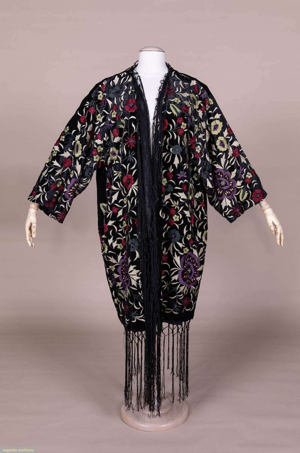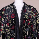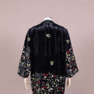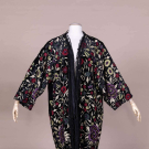 Embroidered black rayon velvet robe w/ fringe, 1920s inspired, label “Adrienne Landau”, L 40”-53”. Very good.