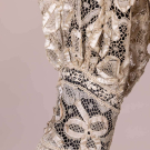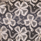 Ecru clover motif lace bodice w/ applied silk satin ribbon, B 34”, L 16”. Good.