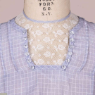 Blue w/ white windowpane patterned cotton day dress, lace inset at neck, B 34”, W 26”, L 56”. Very good.