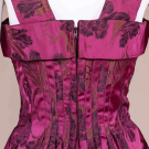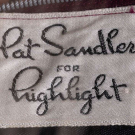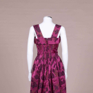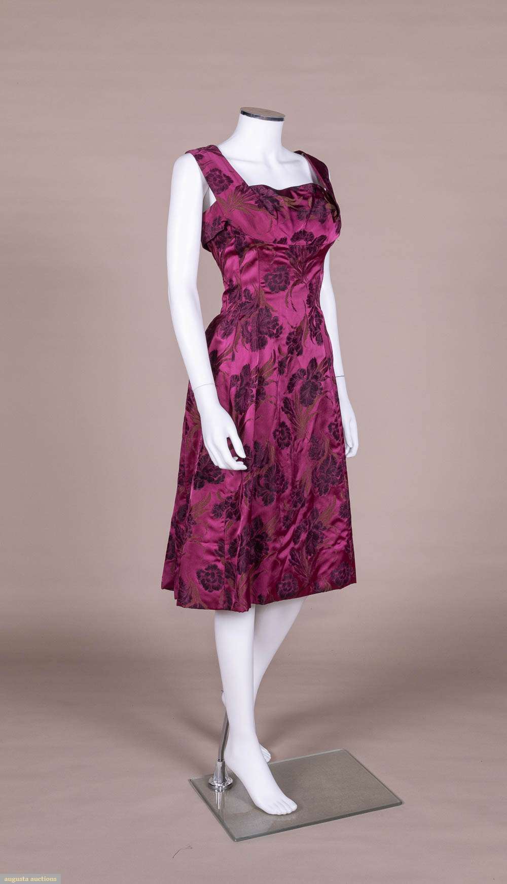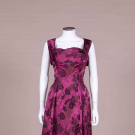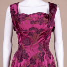 Purple brocade evening dress woven w/ iris motif, label “Pat Sandler for Highlight”, B 36”, W 28”, L 41”. Excellent.