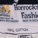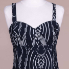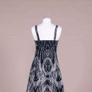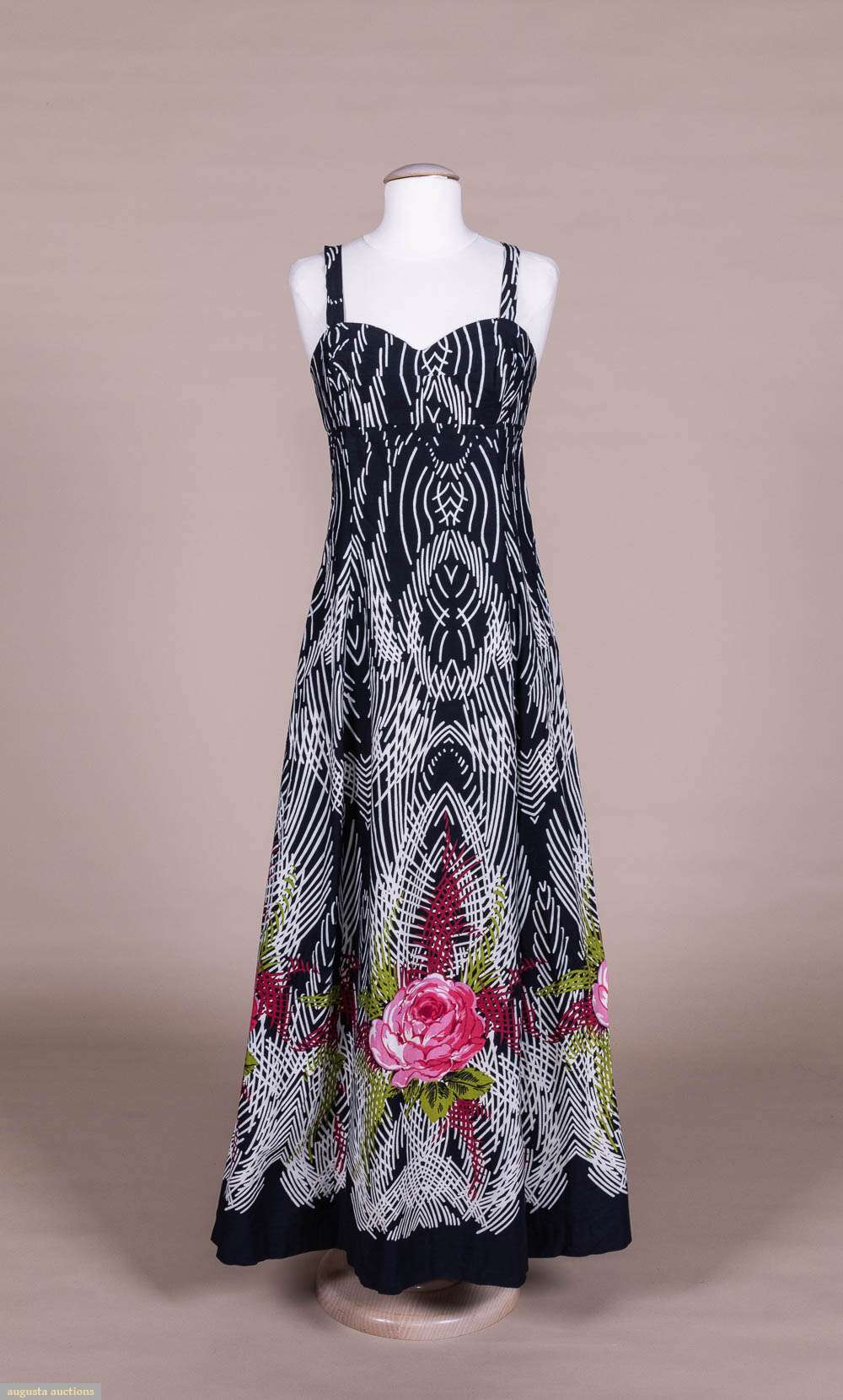 Black and white geometric striped cotton maxi dress w/ vibrant floral motif at hem, label “Horrockses Fashion”, B 34”, W 28”, L 54”. Excellent.