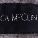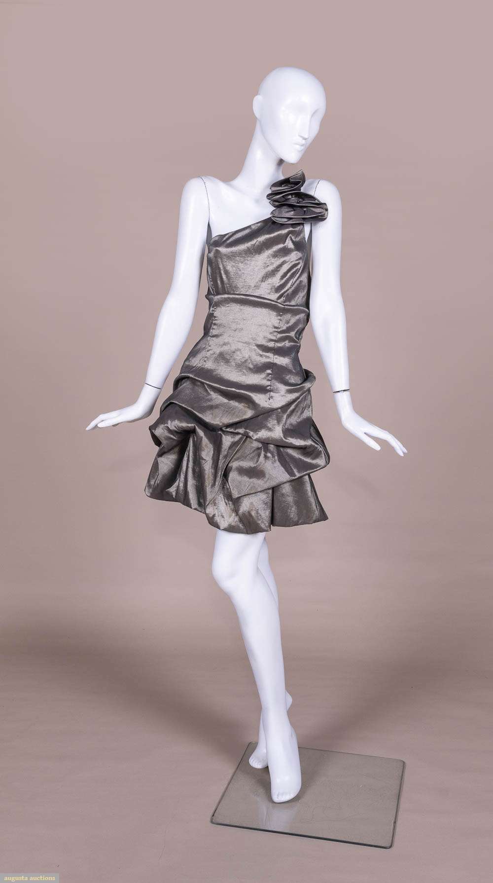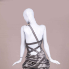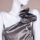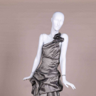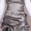Metallic silver party dress w/ asymmetrical one-shoulder, ruched skirt and dramatic strappy back, label “Jessica McClintock”, B 32”, W 28”, L 35”. Excellent.